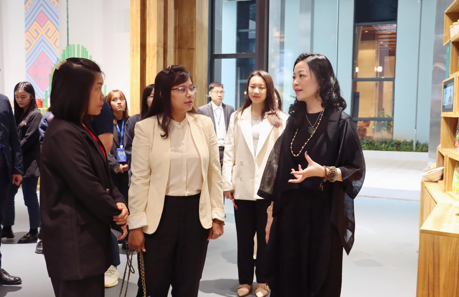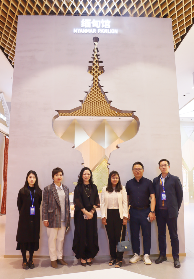 在參觀匯聚中心17個(gè)國(guó)家及地方特色展館過程中,趙海燕董事長(zhǎng)介紹了匯聚中心展館如何通過人文設(shè)計(jì)理念烘托出各國(guó)當(dāng)?shù)靥厣a(chǎn)品,以沉浸式的獨(dú)特商品貿(mào)易體驗(yàn)促進(jìn)交易。作為匯聚中心精心打造的國(guó)家主題展館,緬甸館以該國(guó)傳統(tǒng)特色文化為基調(diào),巧妙融合本地風(fēng)土人情元素打造的“金色緬甸”效果,贏得了高凱玨參贊的認(rèn)可。她表示緬甸館不僅設(shè)計(jì)別出心裁,而且能夠在一定的空間里盡可能地將緬甸多元文化與特色產(chǎn)品展示出來,可見項(xiàng)目策劃人所費(fèi)的心思不一般。