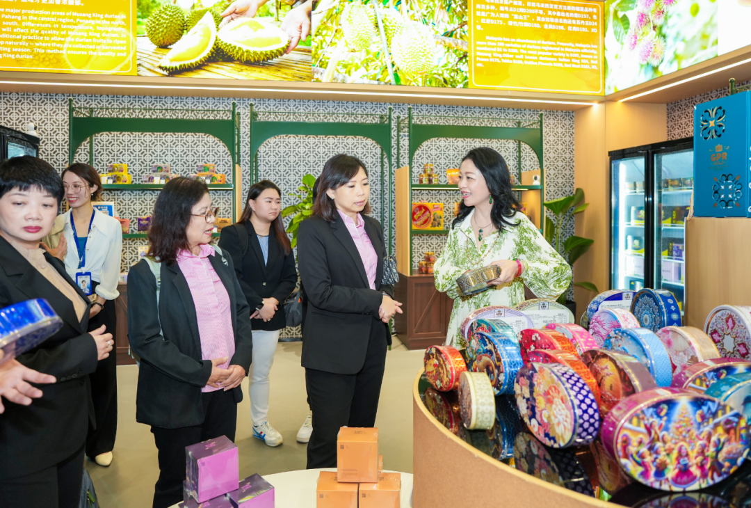 來到馬來西亞館,各類富有當(dāng)?shù)靥厣娜宋娘L(fēng)俗與“僑元素”生動(dòng)呈現(xiàn):從標(biāo)志性的雙子塔、五大經(jīng)濟(jì)走廊,到傳統(tǒng)巴迪布、高腳屋和榴蓮樹造景,無不喚起代表團(tuán)的熟悉與親切之感。館內(nèi)還陳列了燕窩、巧克力、白咖啡等特色商品,進(jìn)一步增強(qiáng)了實(shí)地體驗(yàn)的氛圍。大家紛紛就館內(nèi)已入駐商品的運(yùn)營推廣情況,進(jìn)行詳細(xì)的了解和探討。在得知各館均有相應(yīng)館長對(duì)商品進(jìn)行管理與推介時(shí),代表團(tuán)更是稱贊連連。