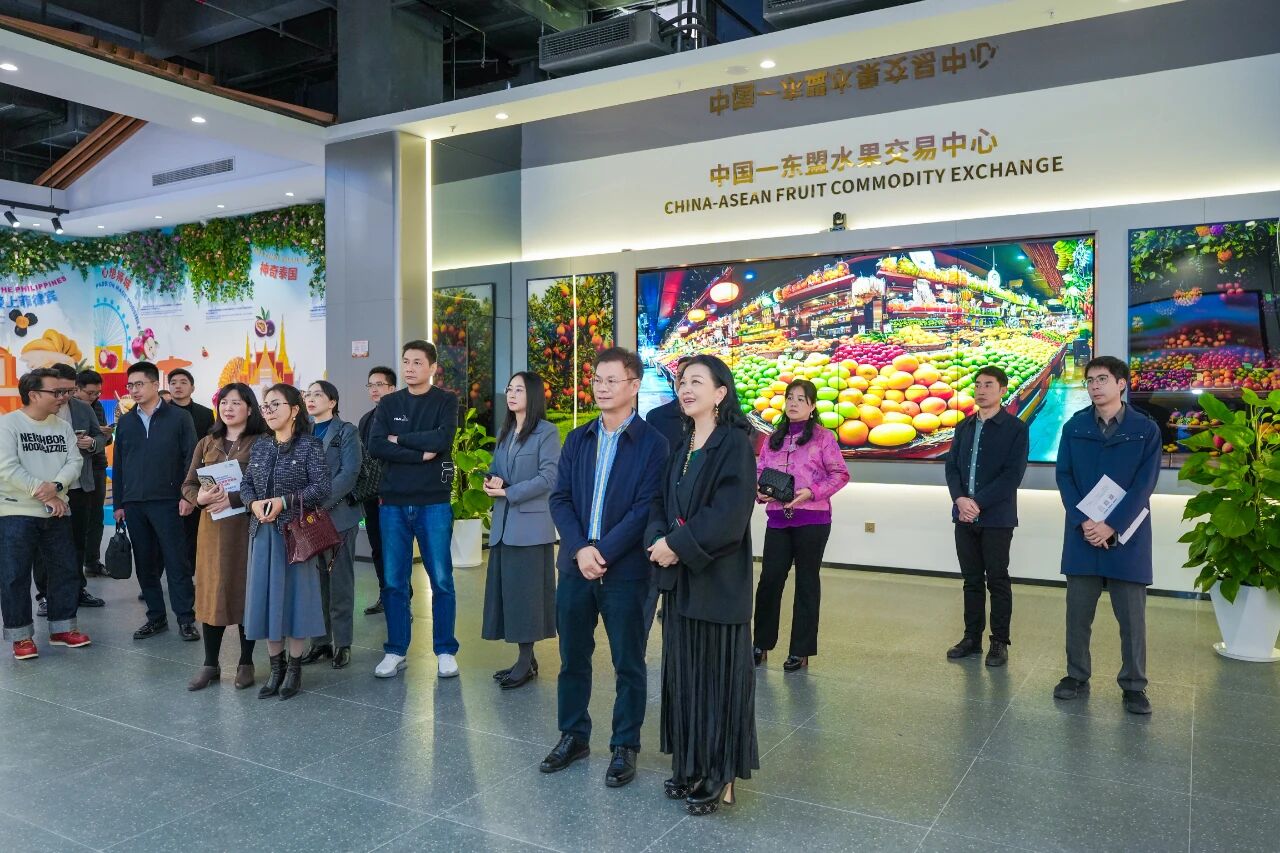 初冬時節(jié),碧空萬里。2025年11月21日,中國食品藥品企業(yè)質(zhì)量安全促進會廣西代表處一行蒞臨中國—東盟特色商品匯聚中心(簡稱“匯聚中心”)和中國—東盟水果交易中心(簡稱“水果交易中心”)參觀調(diào)研并座談交流。廣西新中產(chǎn)業(yè)投資有限公司、中國—東盟特色商品匯聚中心董事長趙海燕熱情接待。
