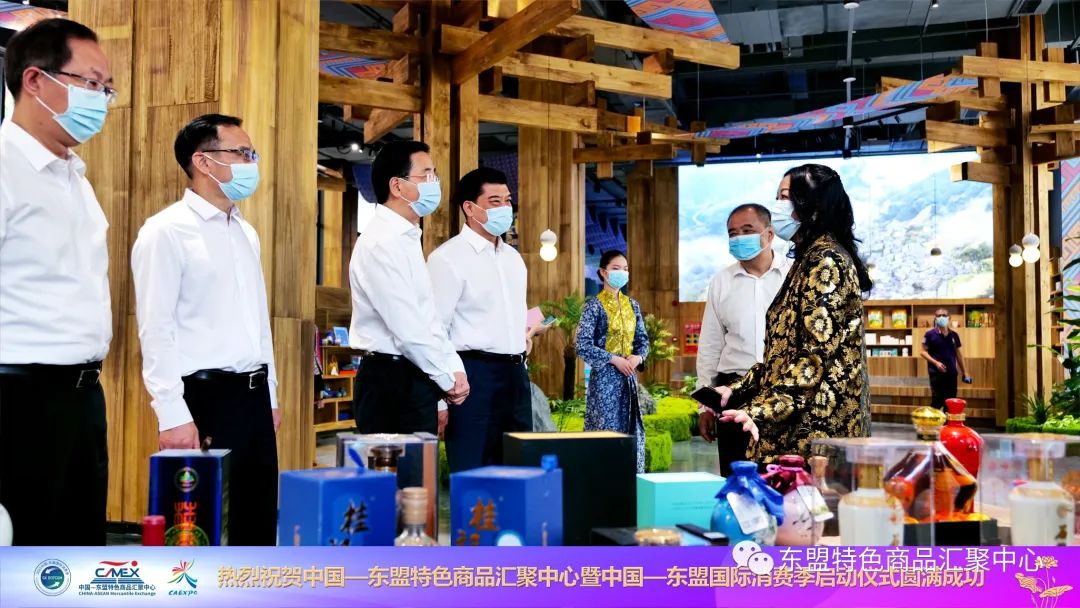啟動儀式結(jié)束后,張曉欽等自治區(qū)及南寧市領(lǐng)導、東盟各總領(lǐng)事、企業(yè)代表等一同參觀了中國—東盟特色商品匯聚中心展館,對匯聚中心的創(chuàng)新理念給予充分地肯定。在設(shè)計藝術(shù)上,展館不僅突顯各個東盟國家獨具匠心的人文風情和建筑風格;在商品展示中,還陳列了各式各樣別具特色的RCEP國家特色商品,如廣西的網(wǎng)紅“螺螄粉”;東盟國家的咖啡、燕窩、芒果干等產(chǎn)品;巴基斯坦的工藝品;健康養(yǎng)生的清真食品等,讓人賞心悅目,味覺大開,給來賓帶來沉浸式的貿(mào)易體驗,觸動了現(xiàn)場嘉賓消費的熱情,更讓現(xiàn)場參觀的商家贊不絕口,對入駐匯聚中心表示極大的熱情。