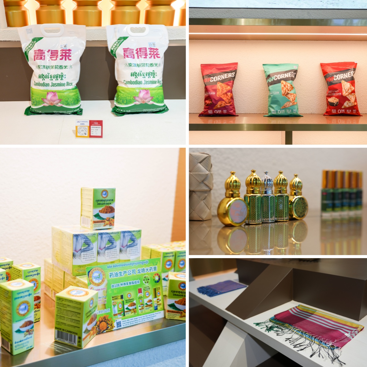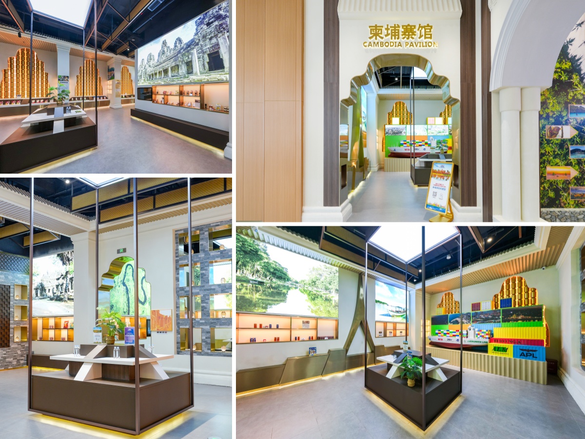 柬埔寨主題館內(nèi)集中展示了香米、棕糖、啤酒等特色商品。這些甄選自當?shù)氐牡氐里L物,以其獨特的風味備受青睞,向到訪嘉賓傳遞著舌尖上的高棉風情。